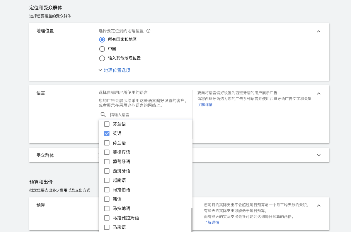 谷歌廣告的后臺(tái)管理有很多填空,比如:費(fèi)用預(yù)算填詞語(yǔ)、關(guān)鍵字填詞語(yǔ)和廣告與填詞語(yǔ)等: